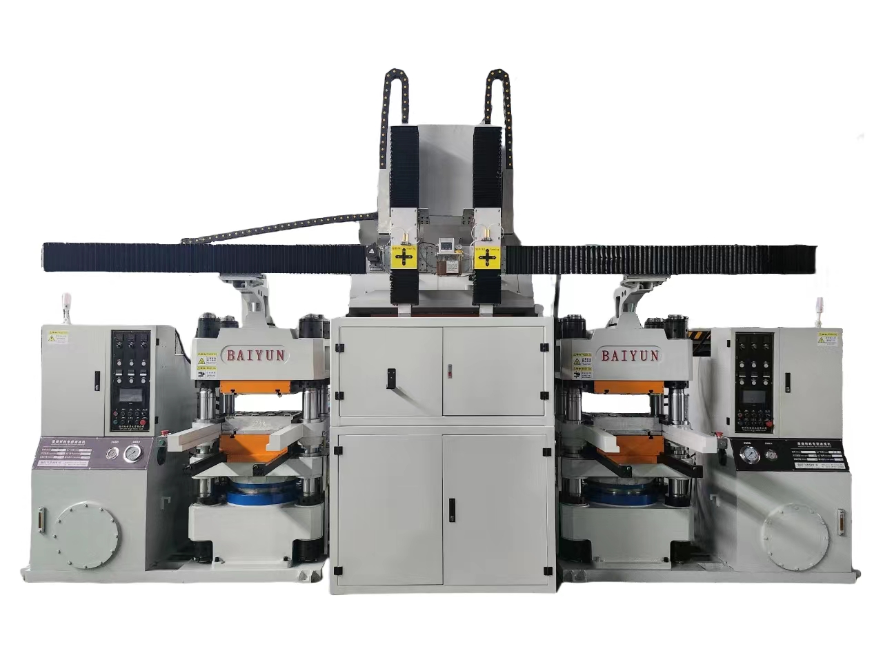 该热压机组由两台单独压机和一台自动称量机和桁架投料手组成。能实现自动上料、自动称料,自动投面料、自动投底料等动作,是目前盘式片热压生产线 实现多配方、多品种生产时最佳设备选择.
